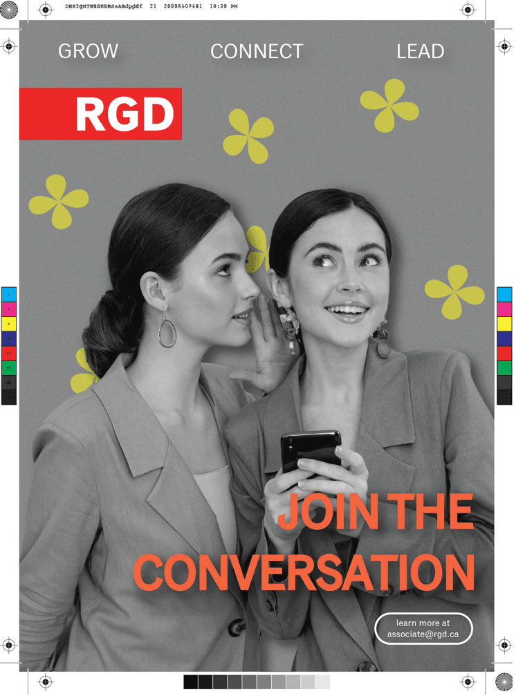 The associate committee provides a space for designers to grow, connect, and lead by expanding their creative network and contributing to design initiatives. The challenge was to create a visual concept that would clearly establish these pillars of the associate’s initiatives while appealing to a design-literate audience and encouraging other designers and RGD members to join the associate committee to network and grow.