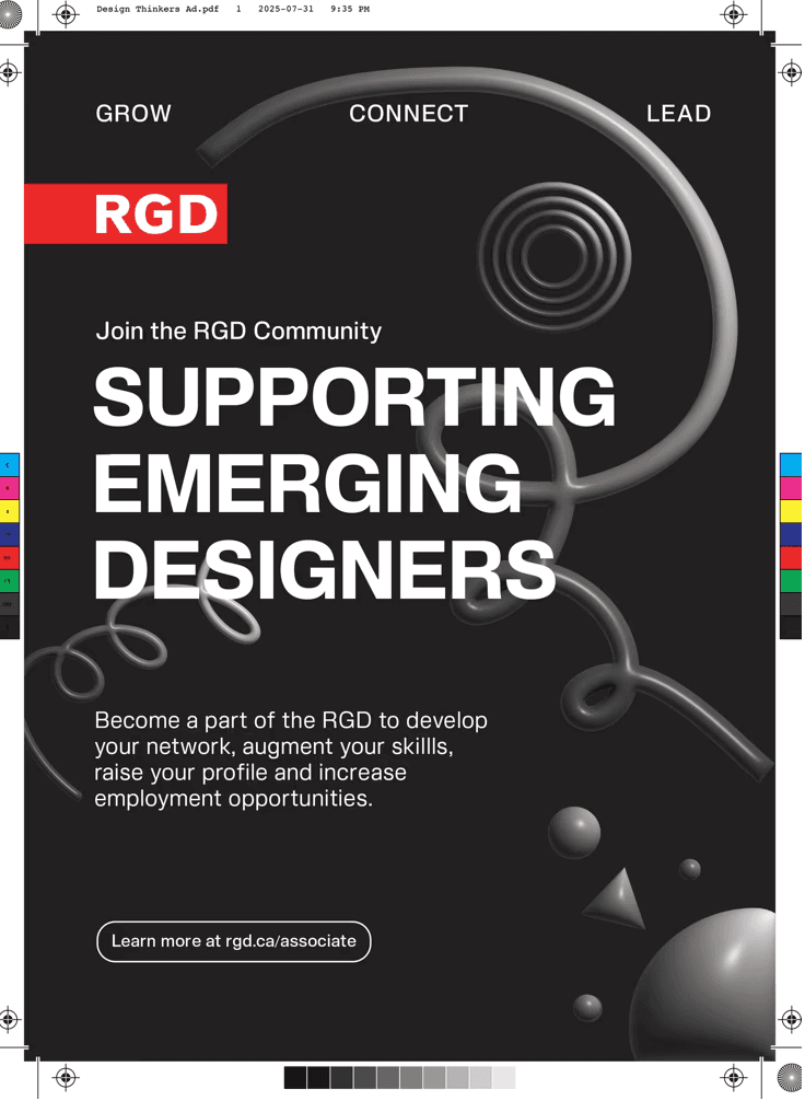 The concept for the “Shaping Emerging Designers” associate artwork communicates the committee’s mission to support and empower emerging designers through a bold and modern visual approach. The basis of the artwork utilises a striking colour contrast of the white headline against the stark black background, enhancing legibility and impact. The use of a simple sans-serif typography conveys clarity while the red RGD logo adds a pop of colour against the black background, directing the viewer's eye and reinforcing the association’s recognition. A collection of dynamic, looping 3D graphics is found throughout the design, connecting the copy to symbolize creativity, growth, and the evolving journey of a designer. Paired with additional subtle 3D geometric graphics, the visuals add depth and visual interest to the artwork without overwhelming the key message. To reinforce the keywords “growth,” “connect,” and “lead,” the words have been anchored to the top of the artwork, establishing them as clear pillars of the associate’s initiatives.