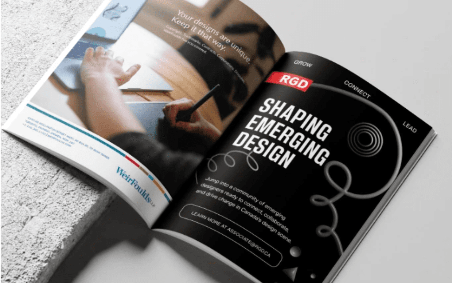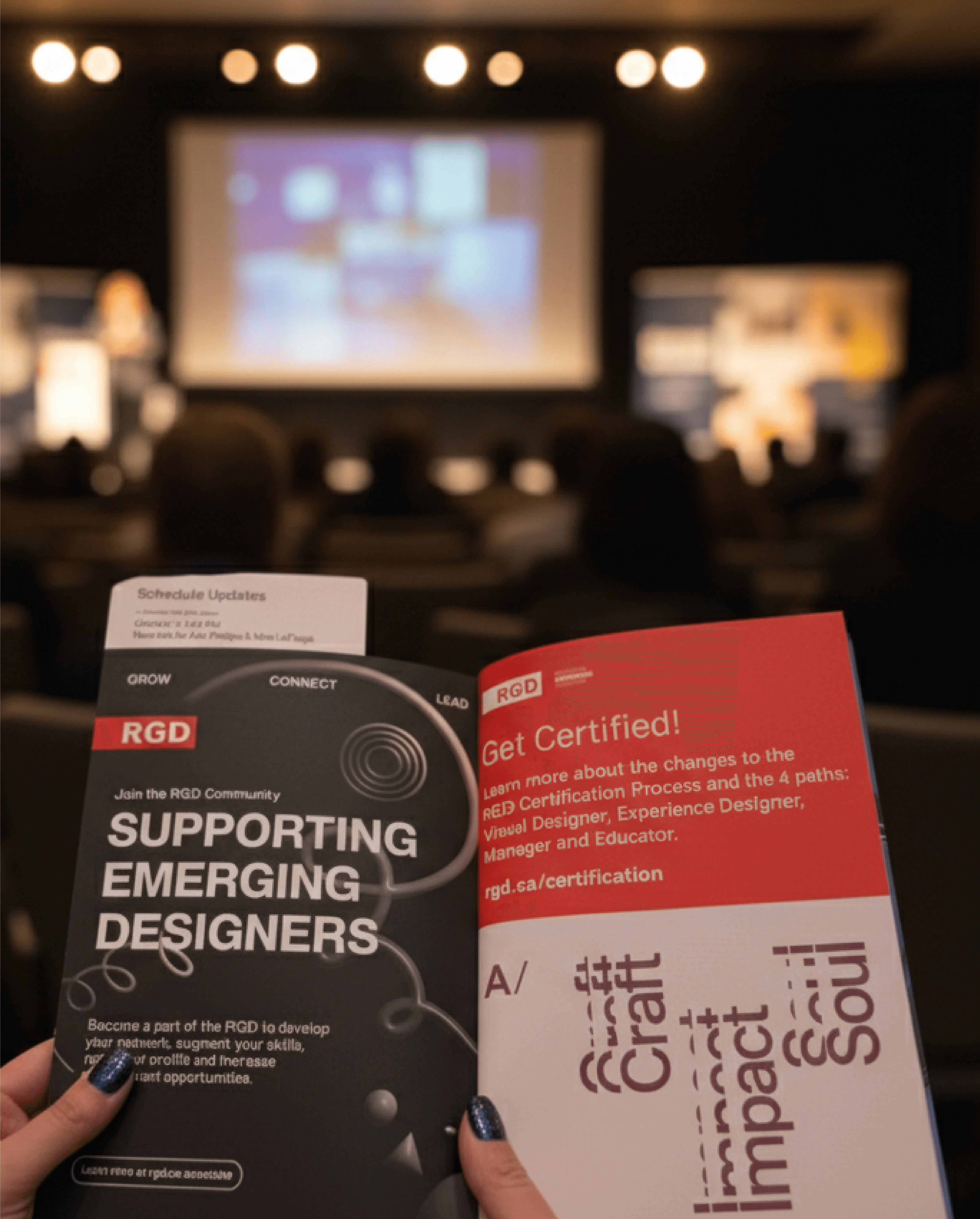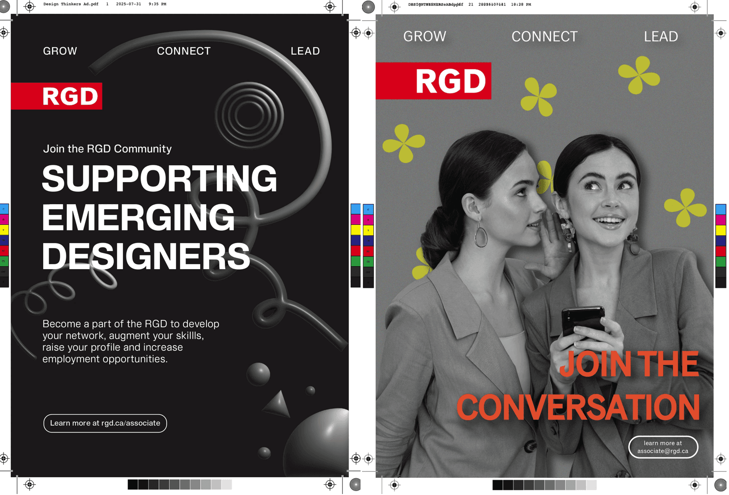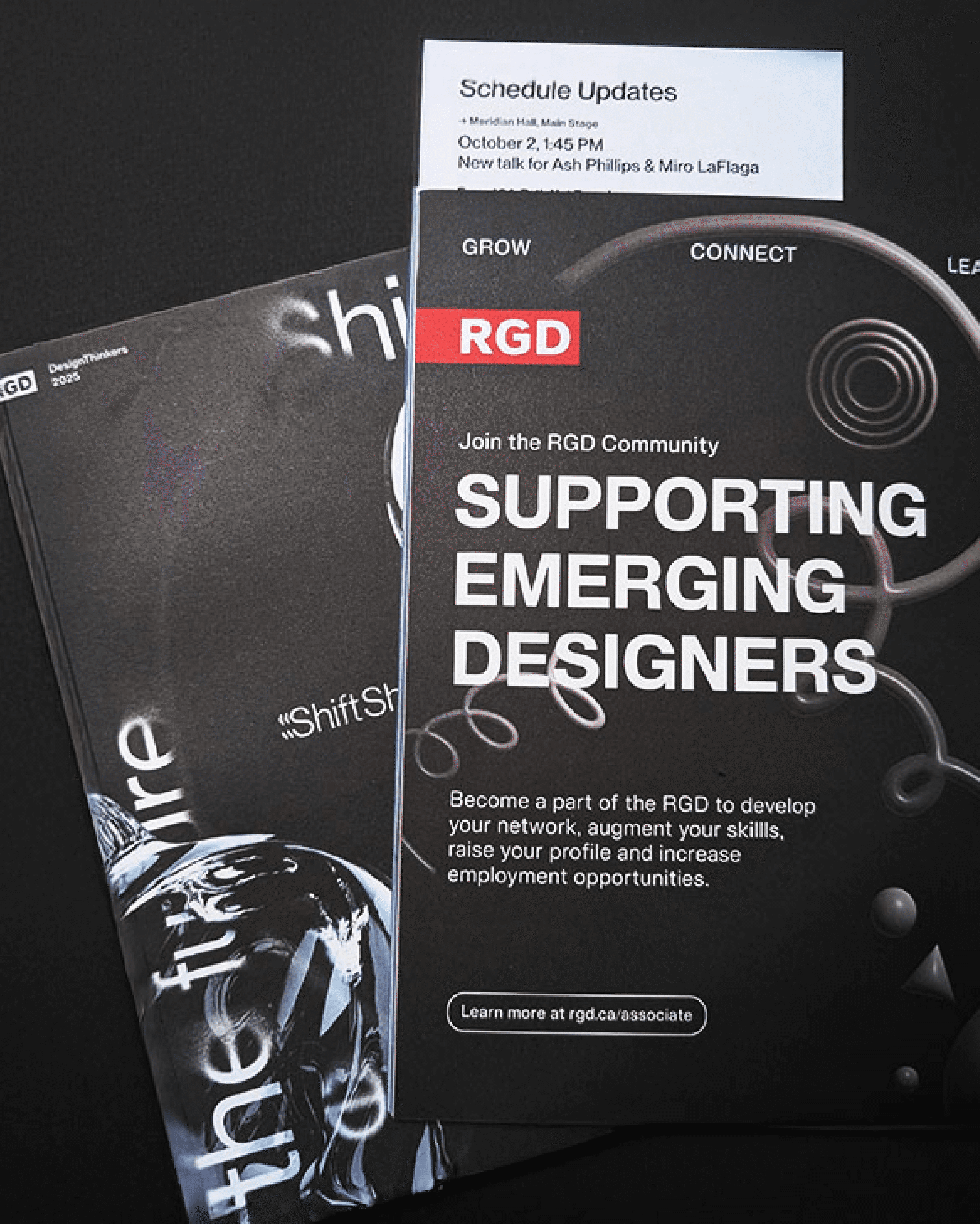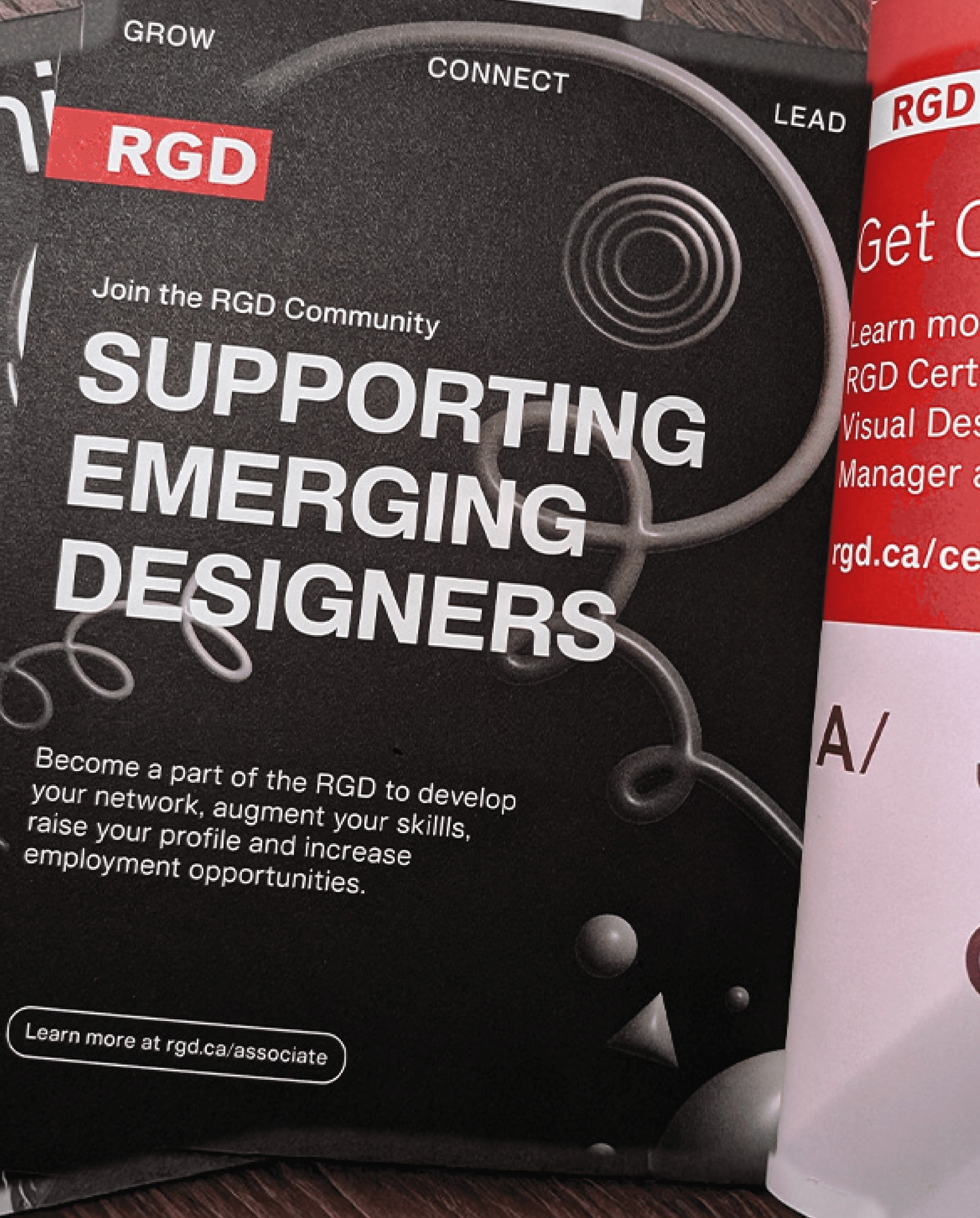 The concept for the “Shaping Emerging Designers” associate artwork communicates the committee’s mission to support and empower emerging designers through a bold and modern visual approach. The basis of the artwork utilises a striking colour contrast of the white headline against the stark black background, enhancing legibility and impact. The use of a simple sans-serif typography conveys clarity while the red RGD logo adds a pop of colour against the black background, directing the viewer's eye and reinforcing the association’s recognition. A collection of dynamic, looping 3D graphics is found throughout the design, connecting the copy to symbolize creativity, growth, and the evolving journey of a designer. Paired with additional subtle 3D geometric graphics, the visuals add depth and visual interest to the artwork without overwhelming the key message. To reinforce the keywords “growth,” “connect,” and “lead,” the words have been anchored to the top of the artwork, establishing them as clear pillars of the associate’s initiatives.