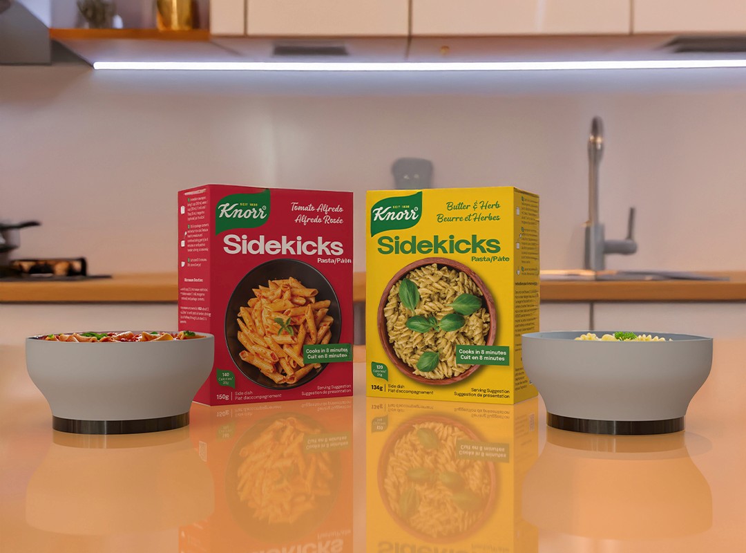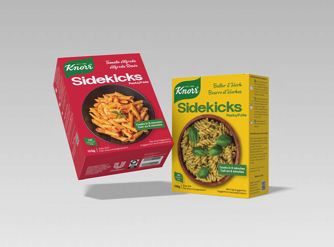 The existing pouch packaging limited space for storytelling and lacked strong shelf impact. With many competitors using bold visuals and structured layouts, Sidekicks risked blending in. The challenge was to modernize the look, improve clarity, and strengthen the product’s emotional connection with consumers, all while keeping it recognizable as part of the Knorr family.